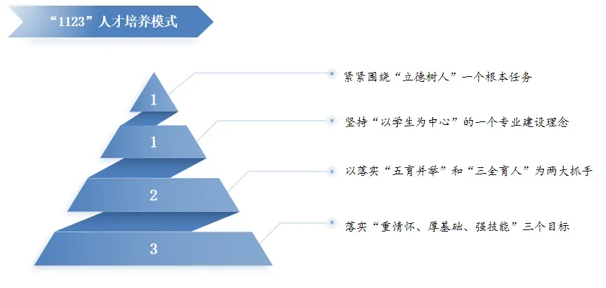 学院秉承传统、守正创新,强化专业内涵建设,着力打造“1123”人才培养模式,即:紧紧围绕“立德树人”一个根本任务;坚持“以学生为中心”的专业建设理念,以落实“五育并举”和“三全育人”为两大抓手;落实“重情怀、厚基础、强技能”三个目标,全面促进教育教学水平和人才培养质量提升。