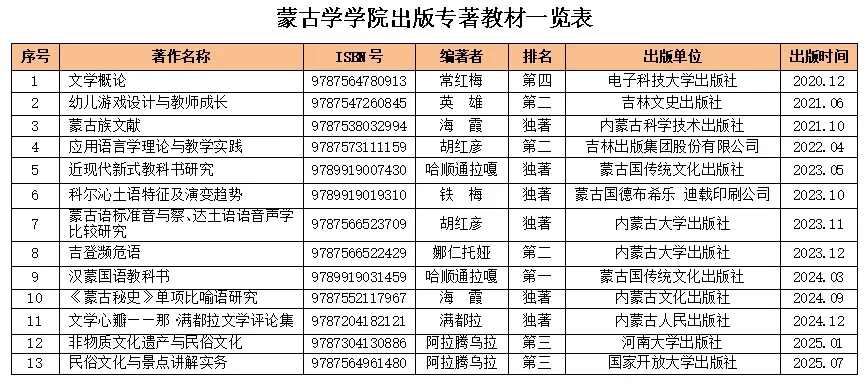 近五年,立项教改课题 21 项、科研课题 28 项,博士基金项目 9 项。教改课题聚焦教学理念创新、教学方法改革以及课程体系优化等关键领域,旨在提升教学质量与人才培养水平。科研课题涉及蒙古语言文化、历史文献、民俗艺术等多个学科方向,深入挖掘蒙古学的丰富内涵与独特价值。博士基金项目为青年学者提供广阔的学术研究平台,推动学科前沿领域的探索与突破。