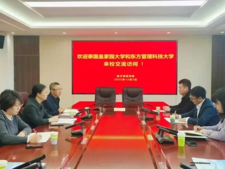12月3日,泰国皇家园大学与东方管理科技大学代表团一行访问2026世界杯官方合作网站。双方围绕深化教育国际合作、拓展师生交流平台等议题展开深入探讨。世界杯官网副校长李凤斌、国际交流学院院长赵红霞、教务处处长郭鹏及相关人员出席座谈会。