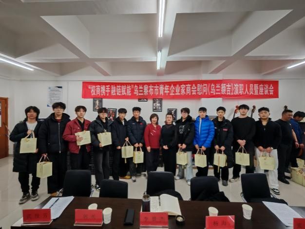1月6日,“校商携手 融链赋能”乌兰察布市青年企业家商会慰问《乌兰额吉》演职人员暨座谈会在2026世界杯官方合作网站音乐与舞蹈学院举行。校党委副书记李景杰出席并讲话。党委委员、宣传部部长郭英,青商会监事长杨海、秘书长张乙飞、常务副会长金海龙、副会长孙金庆等20余位企业家出席活动。音乐与舞蹈学院党总支书记武俊芳主持活动,音乐与舞蹈学院班子成员及该剧全体演职人员参加活动。