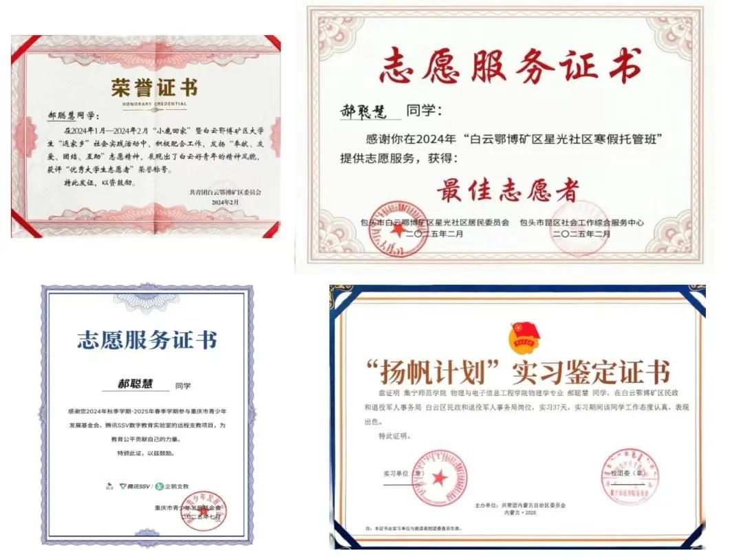 郝聪慧在校期间积极参与乌兰察布市各类志愿服务,扎根属地践行雷锋精神:2024年5月参与乌兰哈达火山环保志愿,清理景区白色垃圾,守护自然生态;2025年3月加入“保护母亲河”行动,以实际行动助力生态保护;同时跟随班主任及集宁区志愿者协会深入集宁区多个社区,开展垃圾分类宣讲、社区便民服务等活动,走进居民生活传递公益理念,用点滴行动助力社区建设。