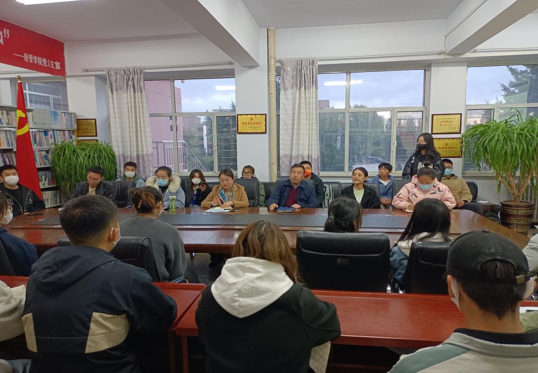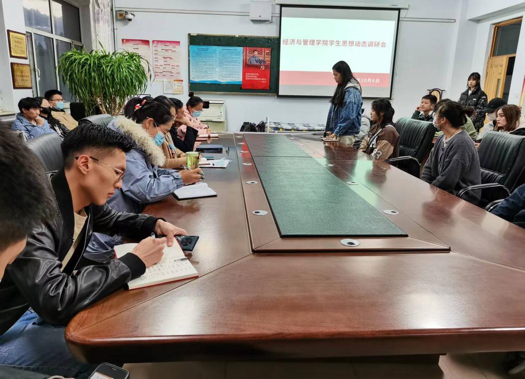 为全面了解学生思想动态,做好学生的服务工作,更好的解决学生在思想、学习、生活等方面遇到的实际问题,广泛征集学生对学校工作的意见和建议,经济与管理学院于10月6日下午在主教楼202举行了学生思想动态调研会。经济与管理学院院长张伟、党总支副书记苗雯娟、副院长张晓利、教学科研科副科长郝文丽、团学办副主任邢彩霞参及各班级代表加了本次座谈会。