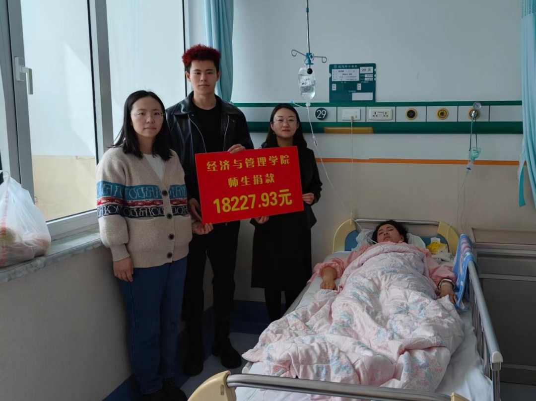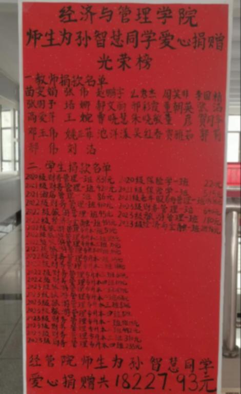 得知此事后,经管院领导高度重视,倡议大家共献爱心。全体师生积极响应,纷纷伸出援手,在短短的时间内师生共为孙智慧同学的母亲筹集治疗费用18227.93元。
