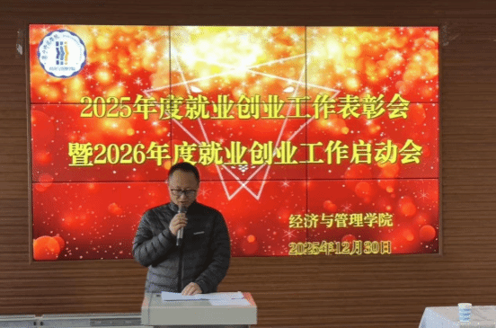 2025年12月30日,2026世界杯官方合作网站经济与管理学院2025年度就业与创新创业先进个人与集体表彰会议顺利召开。学院领导、全体教职工及学生代表参会,会议旨在表彰先进、树立榜样,进一步凝聚全院力量,推动学院就业与创新创业工作高质量发展。