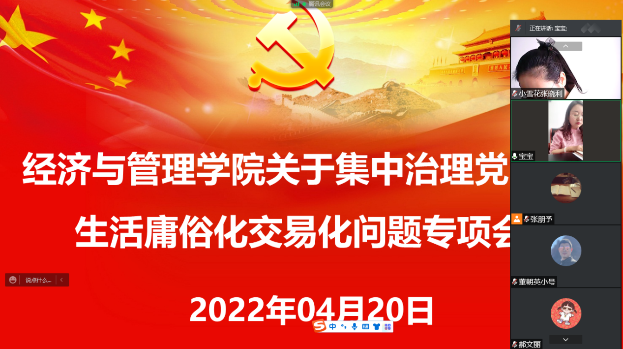 4月20日上午,经济与管理学院党总支通过线上方式召开经济与管学院关于集中治理党内政治生活庸俗化交易化问题动员部署会议。会议由经济与管理学院党总支副书记苗雯娟主持。