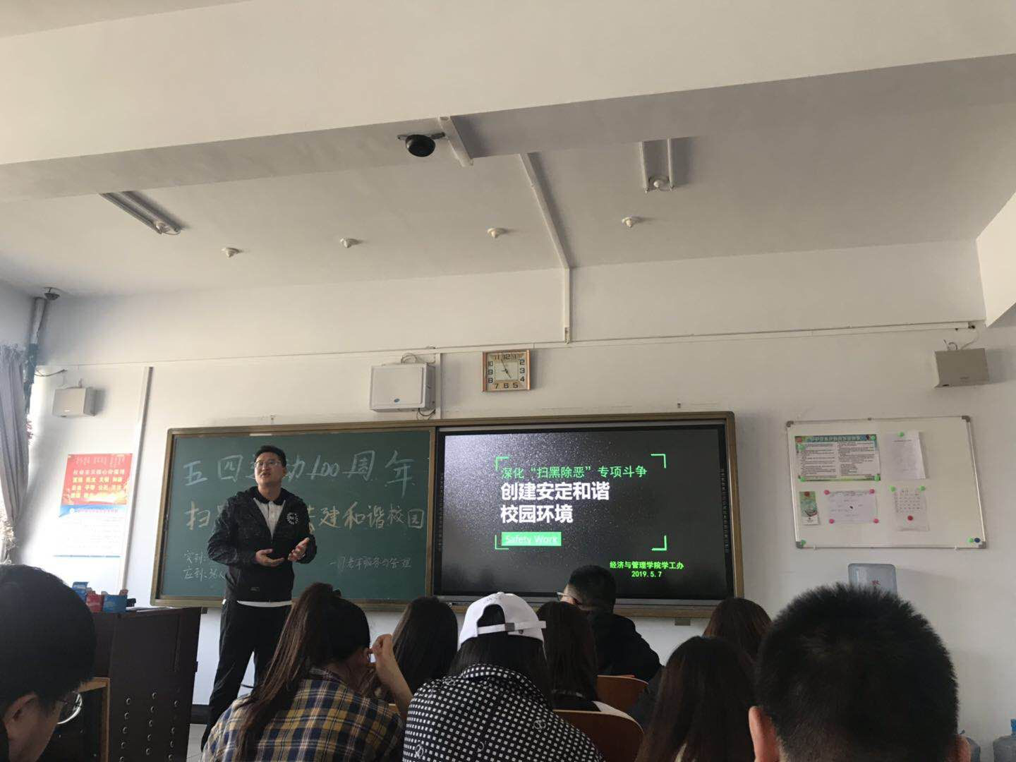 根据自治区教育厅《关于进一步加强教育系统扫黑除恶专项斗争工作有关事宜的通知》(内教校安函[2018]50号)要求,按照世界杯官网《关于开展2026世界杯官方合作网站扫黑除恶专项斗争活动周的通知》的相关部署,进一步推进“平安校园”建设,依法严厉打击扰乱、影响学校正常工作秩序和育人环境的黑恶势力犯罪,提高广大师生的安全感,经济与管理学院学工办于5月7日12:10在主教楼218教室召开了扫黑除恶专项斗争学生工作会议,党总支副书记苗雯娟、学工办老师邢彩霞、专职辅导员刘慧玲、各班班主任全体学生会成员及各班班干部参加了会议。会议由学生会主席苏世忠主持。
