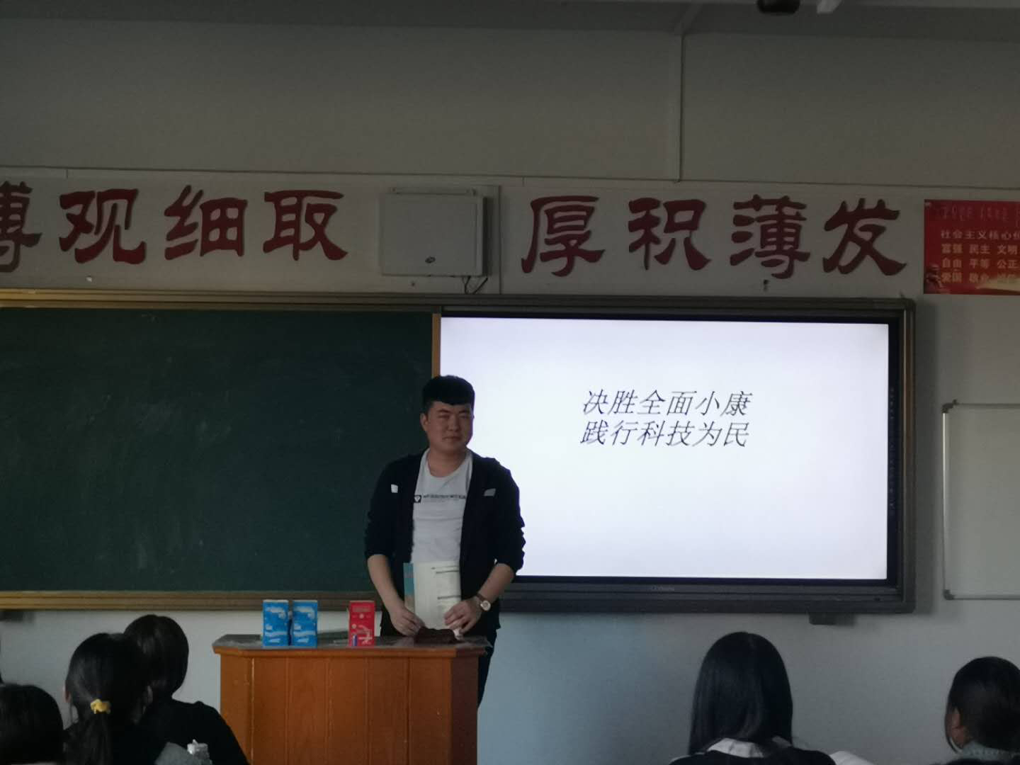 班会上,同学们通过诗歌朗诵、录制微视频、观看视频等活动,营造了爱科学、学科学、用科学的浓厚氛围,通过系列科普活动,践行了科技为民的理念。