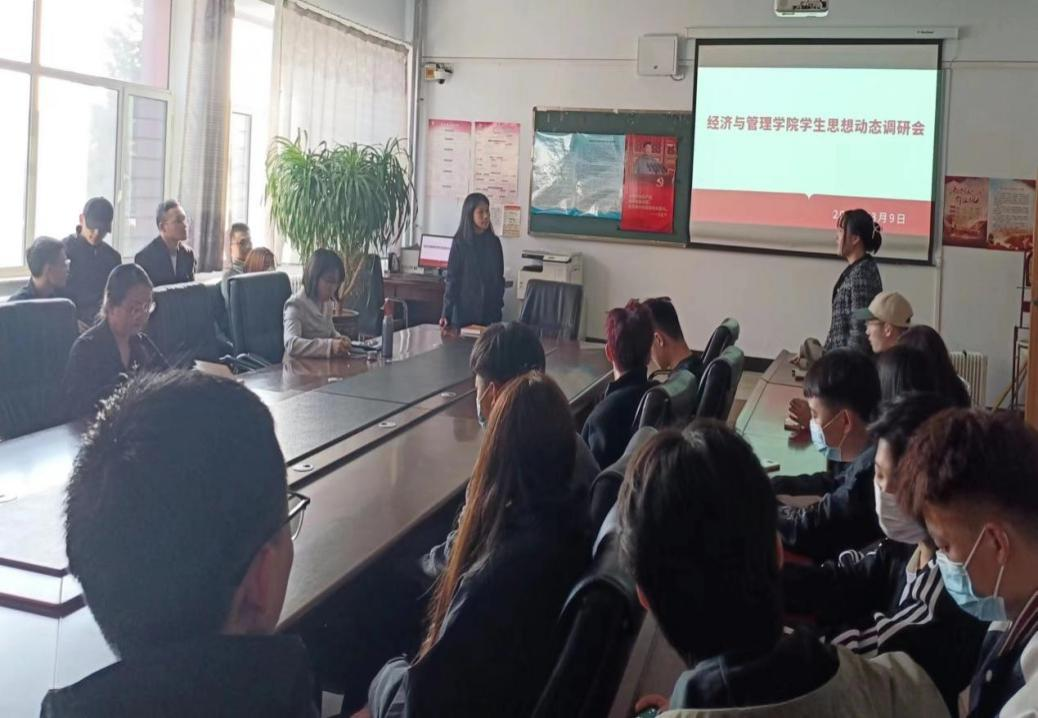 新学期开始,为了更好的与广大学生沟通,了解学生返校后的思想动态,经济与管理学院于3月9日下午在主教楼Z202会议室召开了学生思想动态调研会。经济与管理学院党总支书记苗雯娟、副院长么秀杰、教学科研副科长郝文丽、学团办负责人刘洁及各班级代表参加了本次会议。