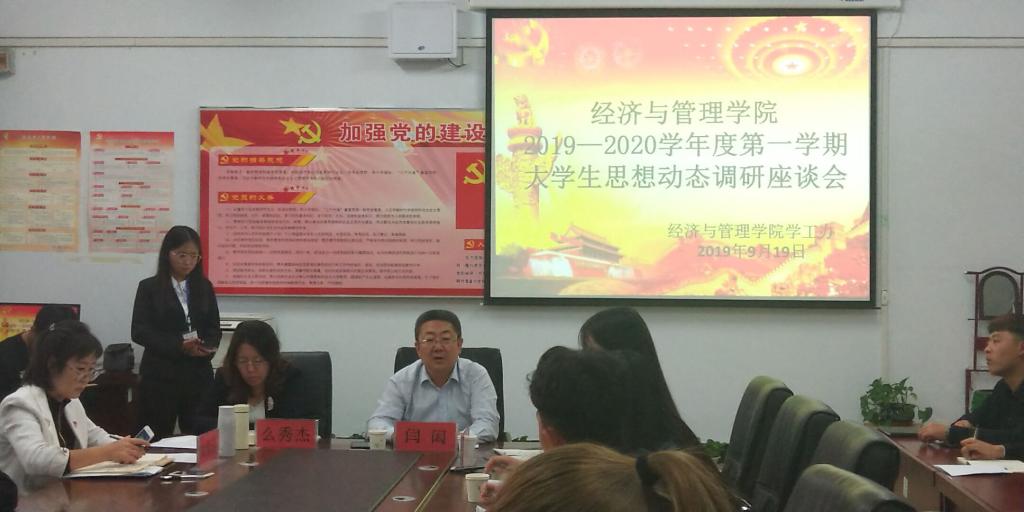 为及时、全面地了解我院学生的思想动态及学习、生活、心理等情况,有针对性地开展学生思想政治教育工作,经济与管理学院于9月19日下午4:30在主教楼202会议室进行了本学期学生思想动态调研工作。经济与管理学院党总支书记闫闳、副院长么秀杰、专职辅导员刘慧玲、学工办主任邢彩霞及所有在校班级的学生代表参加了调研会。