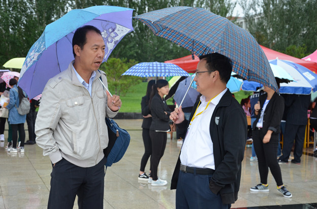 党委副书记赵海忠及相关部门负责人关注新生入学事宜,冒雨来到现场了解新生报到情况。