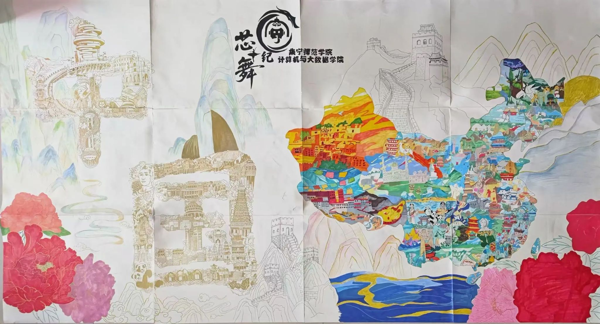 机器人身后的背景画,由队员们亲手绘制而成。画面以厚重有力的 “中国” 二字为视觉核心,直接点明主题,彰显强烈的民族身份认同;嵌入的中国地图清晰勾勒出国土轮廓,承载着对国家疆域的珍视与归属感。整体构图将国家符号、文化元素与团队标识巧妙融合,既展现了对华夏大地的深情,也传递出 “芯舞纪” 团队与国家同频、与文化共生的信念,兼具视觉冲击力与情感共鸣。