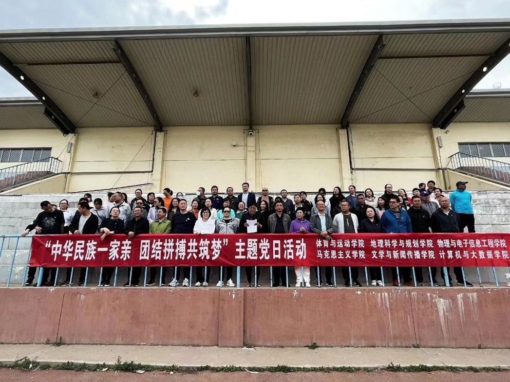 为深入学习宣传贯彻党的二十大精神,深入贯彻落实中央、自治区党委民族工作会议精神,加强党的民族理论政策和民族法律法规的宣传教育,2023年5月25日下午,计算机与大数据学院联合体育与运动学院、马克思主义学院、地理科学与规划学院、文学与新闻传播学院、物理与电子信息工程学院在泉山校区足球场共同举办“中华民族一家亲 团结拼搏共筑梦”主题党日活动。
