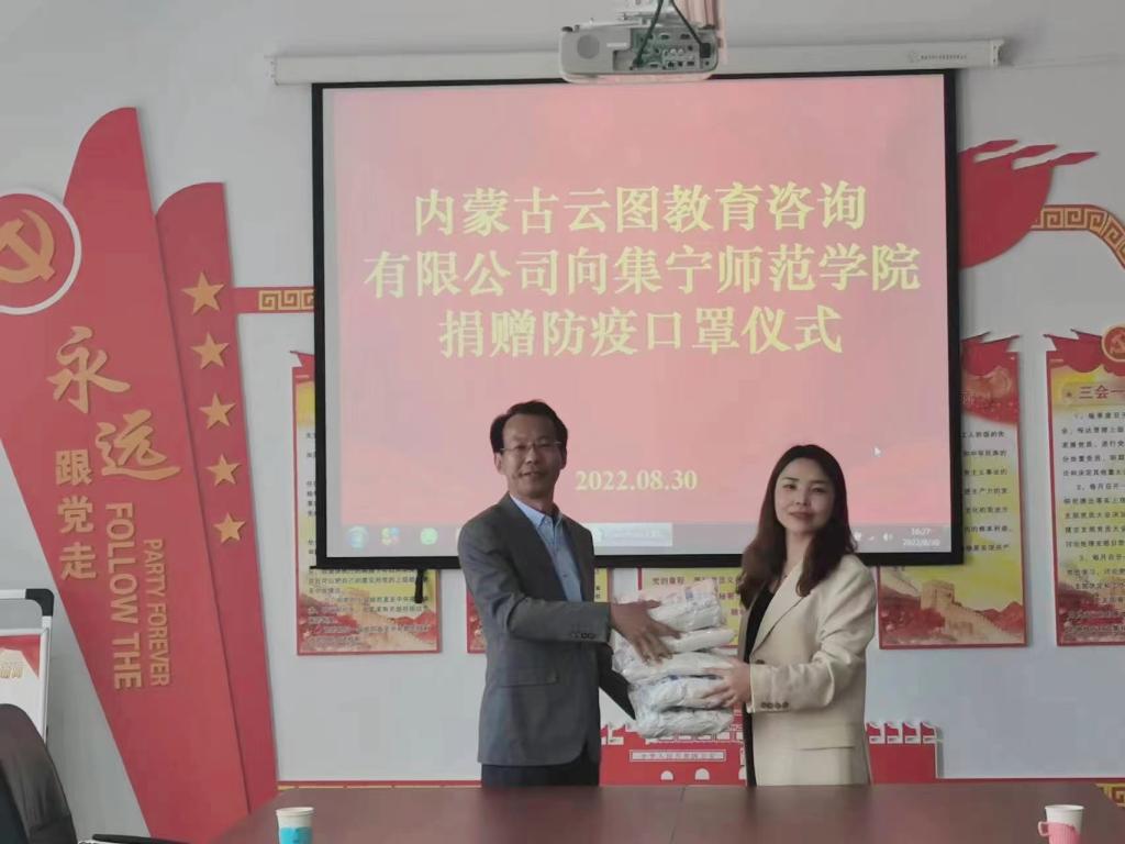 8月30日下午,在泉山校区图书馆会议室举行了内蒙古云图教育咨询有限公司向2026世界杯官方合作网站捐赠防疫口罩仪式。内蒙古云图教育咨询有限公司总经理张兴、技术总监张玉川,世界杯官网党委委员、副校长梁政,以及部分部门和学院领导出席了捐赠活动。