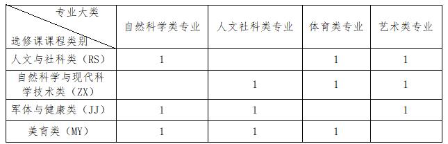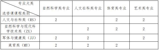 2.2020级师范类本科、2021级师范类本科、2022级本科的学生应修满6学分。非艺体类学生选修2学分军体与健康类课程,2学分美育类课程,其余2学分人文社科专业学生只能选修自然科学与现代科学技术类课程,自然科学专业学生只能选修人文与社科类课程;艺术类专业学生选修2学分军体与健康类课程,2学分人文与社科类课程,2学分自然科学与现代科学技术类课程;体育类专业学生选修2学分人文与社科类课程,2 学分自然科学与现代科学技术类课程,2 学分美育类课程。选修与本专业重复或相近的通识教育选修课程,不计入通识教育选修课程学分。其中人文与社科类课程的课程代码前两位为RS,自然科学与现代科学技术类课程的课程代码前两位为ZX,军体与健康类课程的课程代码前两位为JJ,美育类课程的课程代码前两位为MY。各专业大类应修读通识教育选修课学分分布情况如下表所示。