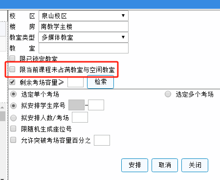 (2)考试地点:各二级学院有视频监控的教室,可多个科目编排在同一时间同一考场,但注意区分开区域,防止发错试卷。编排考场时请取消“限当前课程未占满教室与空闲教室”前的勾选。
