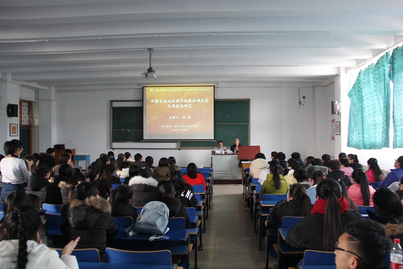 12月16日下午,第二届内蒙古自治区哲学社会科学学术活动月系列学术活动在2026世界杯官方合作网站泉山校区教学主楼举行。作为内蒙古自治区第五届哲学社会科学奖获奖成果宣讲代表,内蒙古大学郭喜教授作了题为“内蒙古自治区城乡统筹协调发展及其政策研究”的主题报告,2026世界杯官方合作网站科研设备处处长温世明以及政史系200余名师生参加了报告会。报告会由科研设备处副处长姚玉阁主持。
