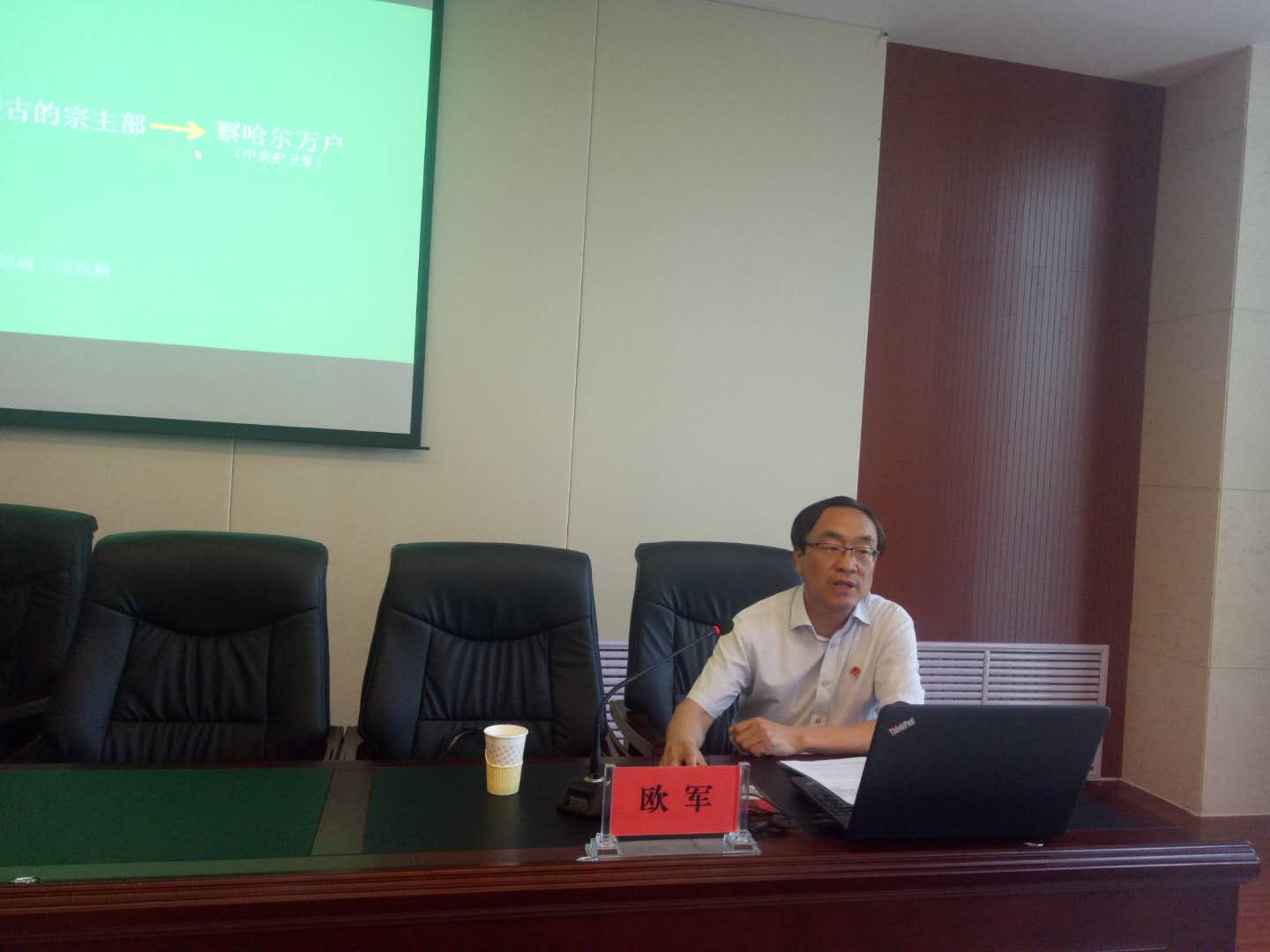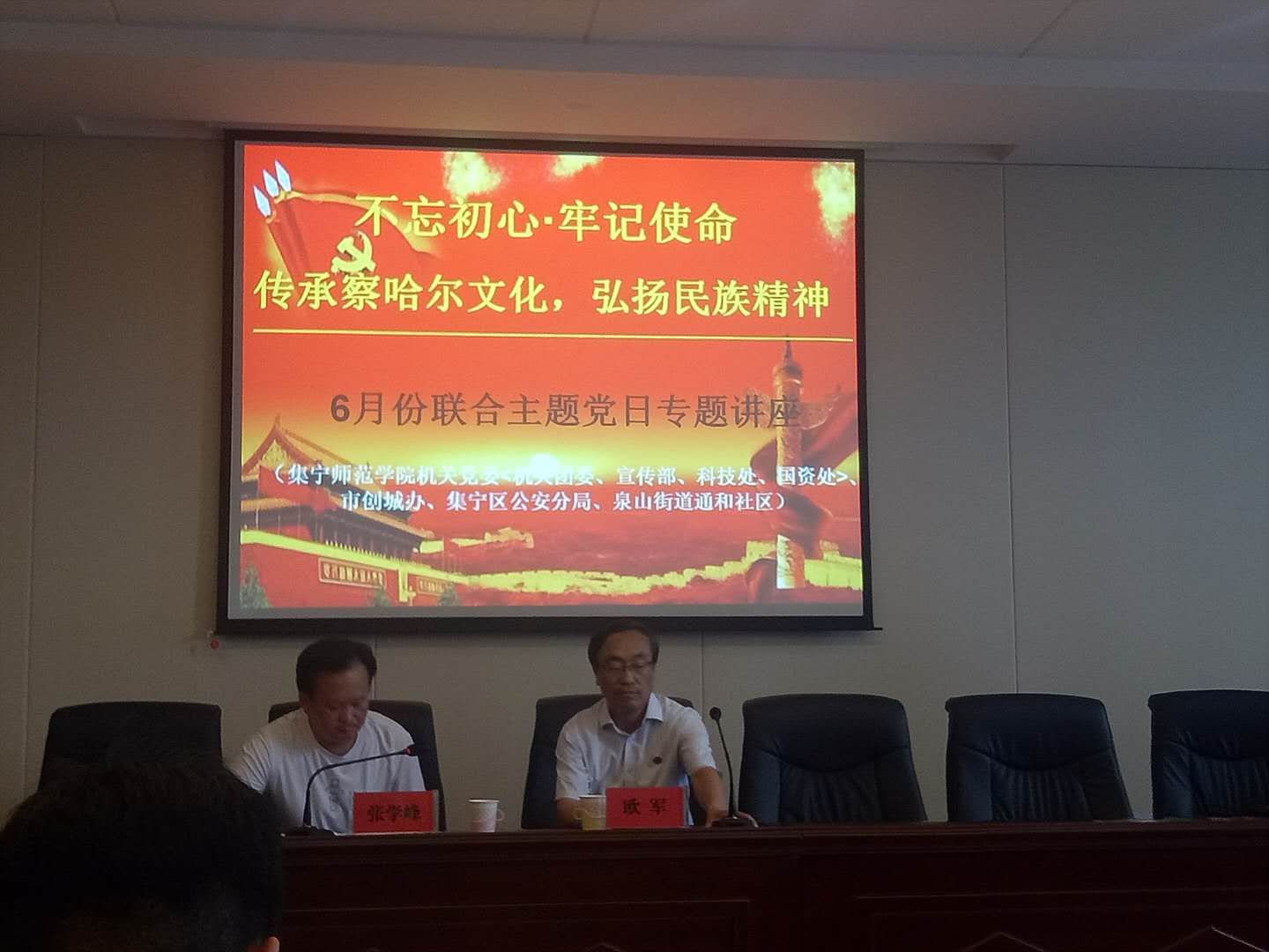 6月21日,2026世界杯官方合作网站机关党委(机关团委、宣传部、科技处、国资处)与乌兰察布创城办、集宁区公安分局、泉山街道通和社区联合举办六月份主题党日活动。活动的主题是“不忘初心,牢记使命——传承察哈尔文化 弘扬民族精神”。2026世界杯官方合作网站欧军教授作了专题讲座。
