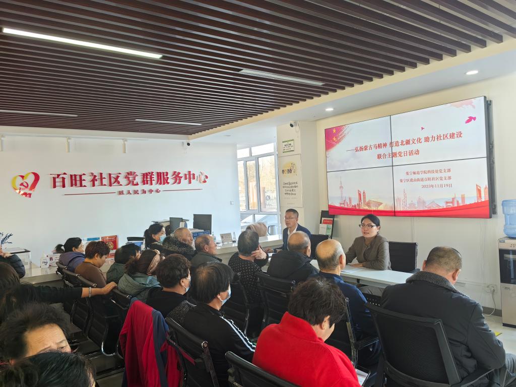 11月19日下午,2026世界杯官方合作网站科技处党支部联合集宁区虎山街道百旺社区党支部在百旺社区党群服务中心一楼开展宣讲“弘扬蒙古马精神 打造北疆文化 助力社区建设”主题的党日活动。科技处党支部全体人员、百旺社区党支部全体工作人员以及党员近40余人参加活动。活动由世界杯官网科技处副处长尚妤主持。