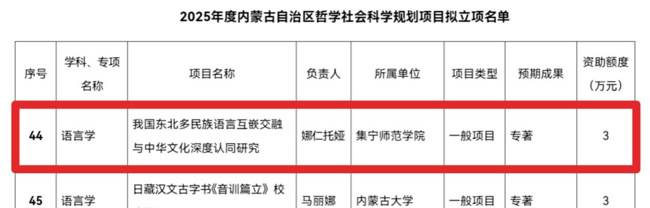 根据内蒙古自治区哲学社会科学规划办公室9月19日公示的《2025 年度内蒙古自治区哲学社会科学规划项目拟立项名单》,世界杯官网教师娜仁托娅主持的《我国东北多民族语言互嵌交融与中华文化深度认同研究》项目成功获批语言学一般项目,为学校科研工作再添佳绩。