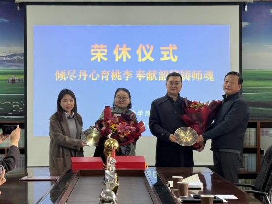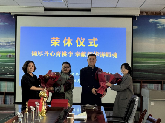 11月6日,蒙古学学院为退休教师图雅、孟克举办荣休仪式。学院全体教师参加活动。学校离退休人员工作处薛晓斐老师出席活动。仪式由学院党总支副书记朝格图主持。