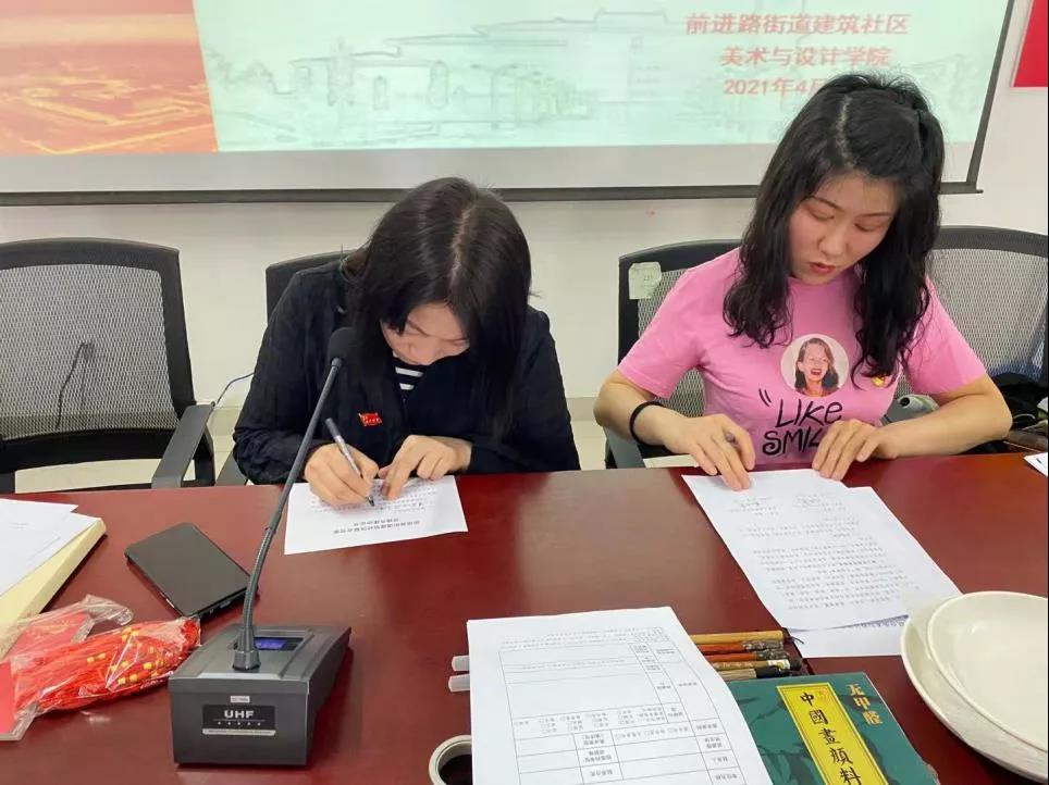 会上,美术与设计学院院长南国栋同志向活动作致辞。美术与设计学院教工党支部书记蔚淑英同志、教工党支部、学工党支部,与前进路街道建筑社区书记闫佩霞同志,双方签订支部共建共驻协议书。