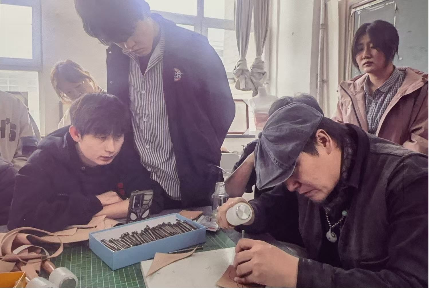 结合学院“非物质文化遗产传承与保护研究所”,与地方非遗传承人合作开展皮雕课程。学生在非遗传承人的指导下,参与从皮革裁剪、草图设计、雕刻的完整劳动流程,将课程所学转化为实际创作能力;在模型制作中,学生自主完成沙盘设计,建筑、景观制作等工序,学生不仅掌握了环境设计专业技能,更体会到劳动在艺术创作中的基础价值。利用彩喷机、激光雕刻机进行实物制作,既强化学生对装饰材料特性的认知,又培养精密操作、工程实施等劳动能力,为美术专业构建了兼具专业性与实践性的劳动教育范式。