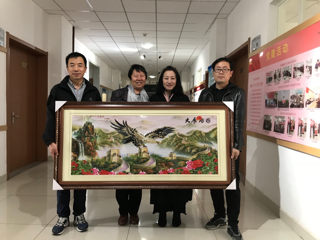 座谈结束后,马书记为美术学院赠送了亲手绣织的《大展宏图》十字绣作品和一封亲笔信,并与班子成员和部分教师合影留念。