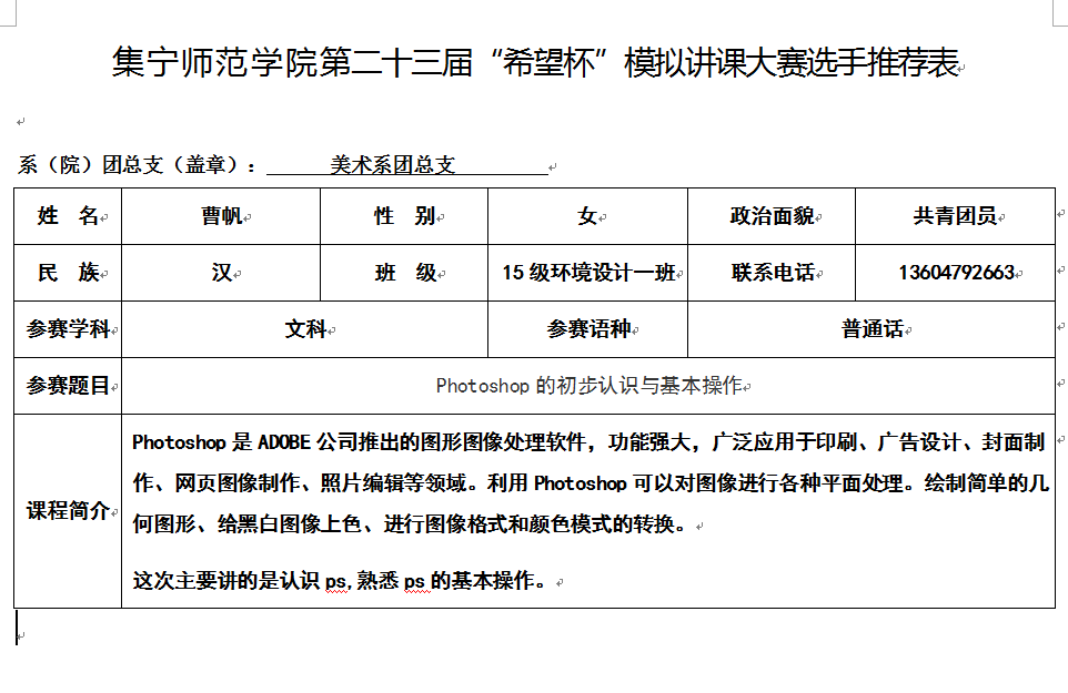 2026世界杯官方合作网站第二十三届“希望杯”模拟讲课大赛选手推荐表