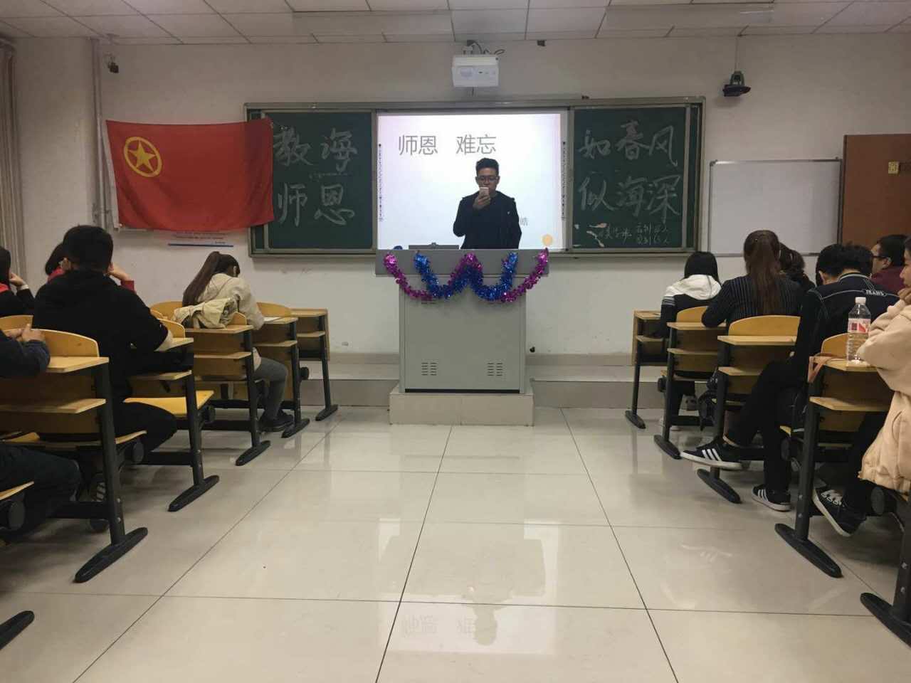 活动气氛热烈,同学们在主持人的带领下一起抒发了对老师的感激之情,拉近师生之间的距离,进一步增进师生之间的友谊,让老师了解学生内心的想法。老师如红烛,燃烧自己,照亮别人,每一个从事教师职业的人都是神圣和伟大的。