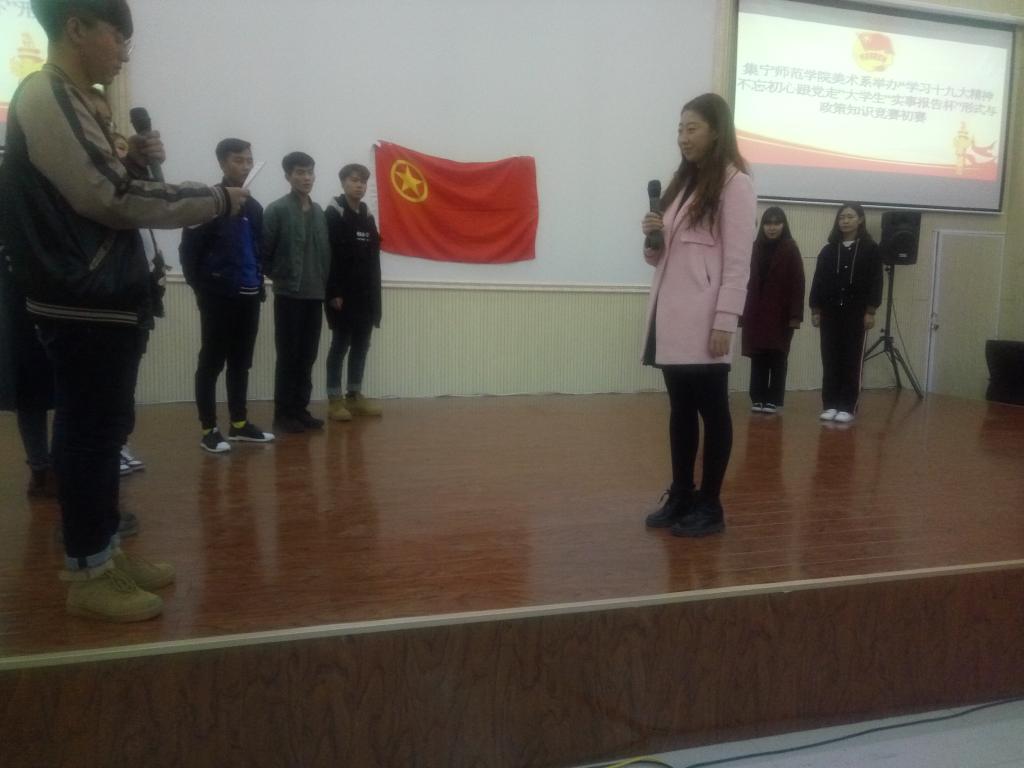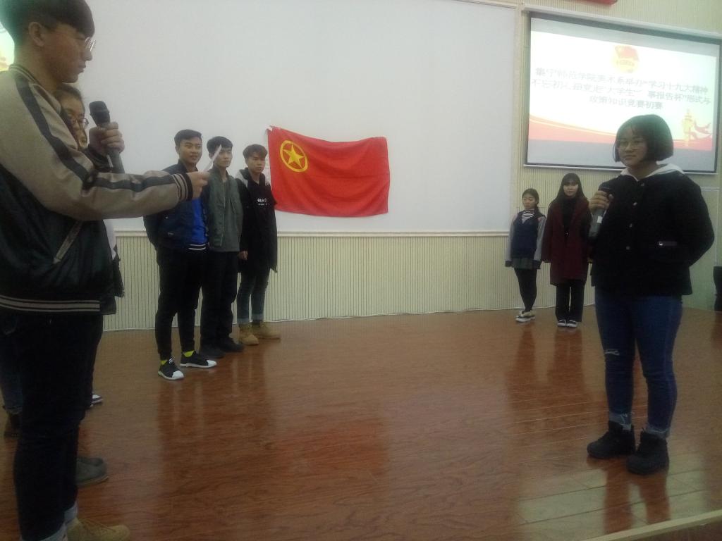 为学习宣传贯彻落实党的十九大会议精神,教育和引导广大青年学生深入学习贯彻习近平新时代中国特色社会主义思想,牢固树立正确的世界观、人生观、价值观,努力成为中国社会主义的合格建设者和可靠接班人。美术学院团总支于2017年11月2日举办“学习十九大精神不忘初心跟党走”大学生“时事报告杯”形式与政策知识竞赛。