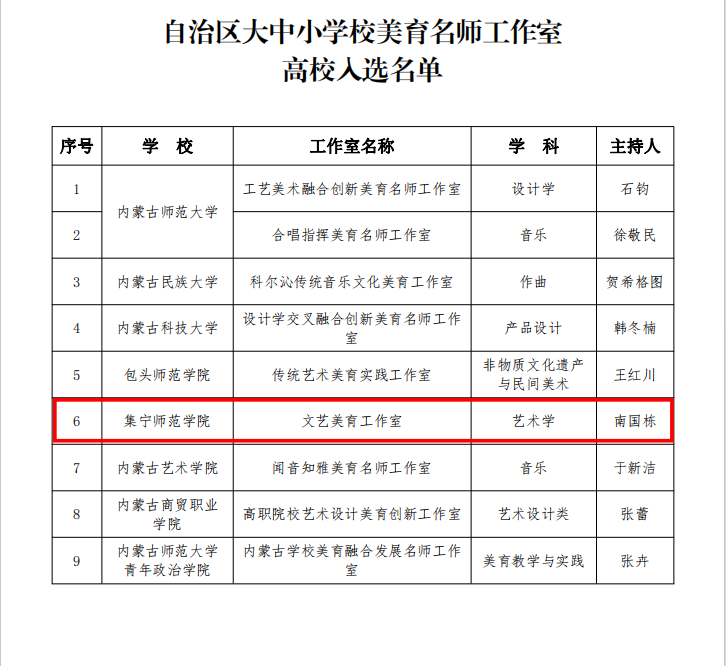 近日,内蒙古自治区教育厅公示了《2023年自治区中华优秀传统文化传承基地(校)、中小学美育示范校及大中小学美育名师工作室立项通知》。按照《关于开展全区大中小学美育名师工作室遴选工作的通知》(内教体艺函〔2023〕30号)要求和有关工作程序,由我院申报,学校推荐,南国栋教授主持的“文艺美育工作室”获批自治区大中小学校美育名师工作室。