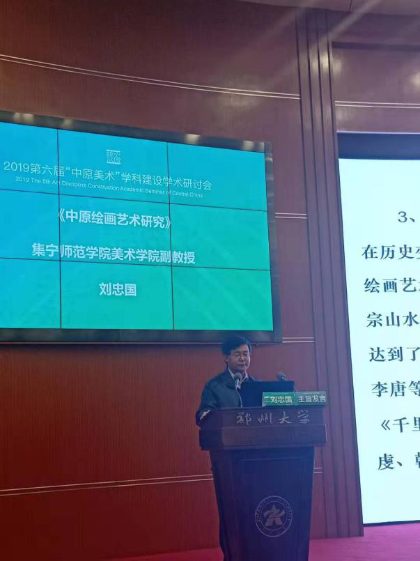 2019年11月30日—12月1日,美术学院教师刘忠国和王军一行,参加了由郑州大学等单位联合主办的2019第六届“中原美术”学科建设学术研讨会,与会者来自全国60多所高校的知名学者、艺术家和研究生等六百多人。刘忠国副教授以《中原绘画艺术研究》为题,在大会上做了精彩的演讲,从时间序列上梳理了历史上所出现的中原绘画艺术,分析了中原画风的缘起,总结了当代学者对中原画风的论述,勾勒了中原画风的历史传承与发展。该议题得到了与会专家教授的一致好评,为此,河南省艺术教育学会会长石品先生,还专门致谢其对河南美术事业的关注和对中原绘画艺术的研究。通过此次会议开阔了世界杯官网教师的学术视野和眼界,也拓展了世界杯官网与国内高大高校学术界的人脉,也很好地宣传了世界杯官网的知名度。