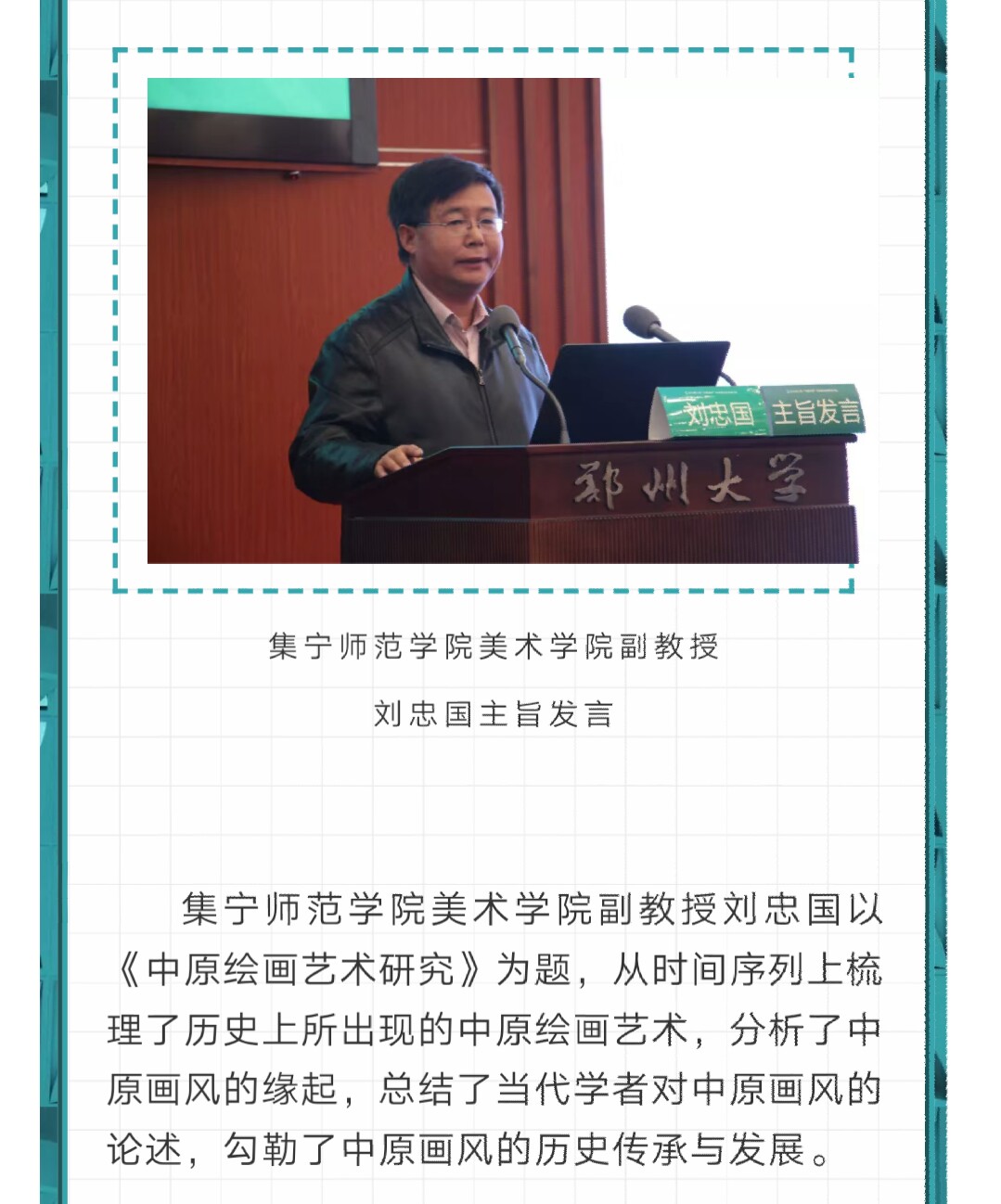 2019年11月30日—12月1日,2026世界杯官方合作网站美术学院教师刘忠国和王军一行,参加了由郑州大学和高等教育出版社等单位联合主办的2019第六届“中原美术”学科建设学术研讨会。会议有省内外60多所高校的知名学者、艺术家和研究生等六百多人,我院副教授刘忠国老师,以《中原绘画艺术研究》为题在大会上做了演讲,他从时间序列上梳理了历史上所出现的中原绘画艺术,分析了中原画风的缘起,总结了当代学者对中原画风的论述,勾勒了中原画风的历史传承与发展。该议题得到了与会专家教授的一致好评,河南省艺术教育学会会长石品先生,还专门找刘老师建立了个人微信联系方式,并感谢其热心关注河南美术事业的发展,感谢其对中原绘画艺术的研究。