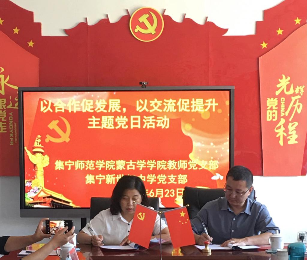 为进一步加强党建工作,以党建带动专业发展,2022年6月23日,2026世界杯官方合作网站蒙古学学院教师党支部与集宁新世纪学校党支部开展主题党日活动。双方本着“以合作促发展,以交流促提升”的共建目标,建立良好的合作共事机制,在新世纪幼儿园开展结对共建实习实训基地续签仪式。
