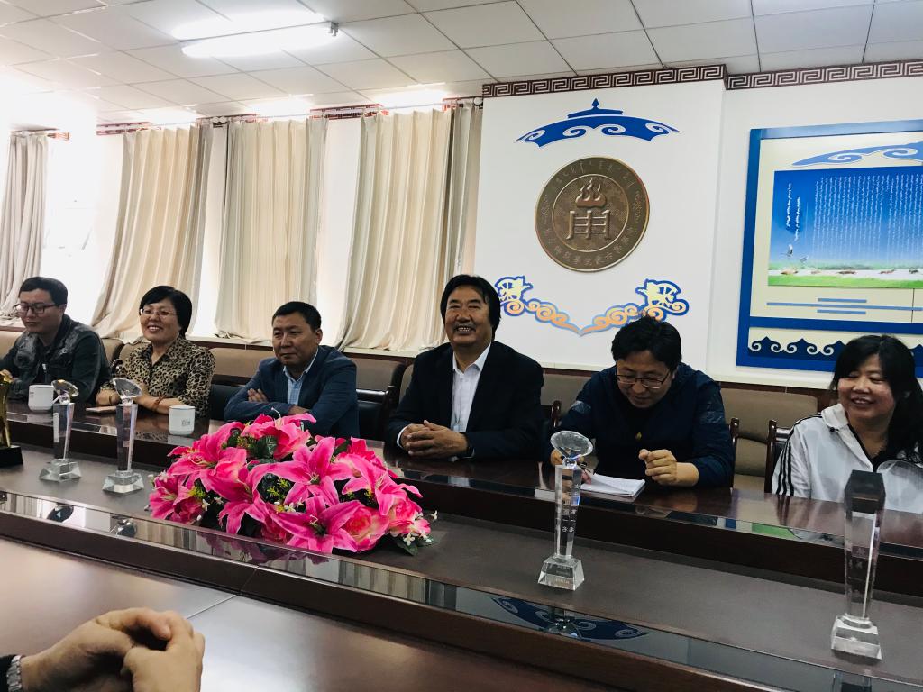 蒙古学学院党总支书记青龙代表学院热烈欢迎河套学院同仁来访,院长南斯力玛介绍了蒙古学学院近年来的发展情况及迎评促建等方面的经验及做法。敖特跟毕力格对我院的热情招待表示感谢,并介绍了河套学院蒙古语言文学系的概况。教务处副处长孟美英、蒙古学学院副院长呼和满都拉介绍了我院迎接本科教学工作合格评估的相关情况。蒙古学学院教研室主任、教学科科长、团总支书记、学工办主任参加会议。