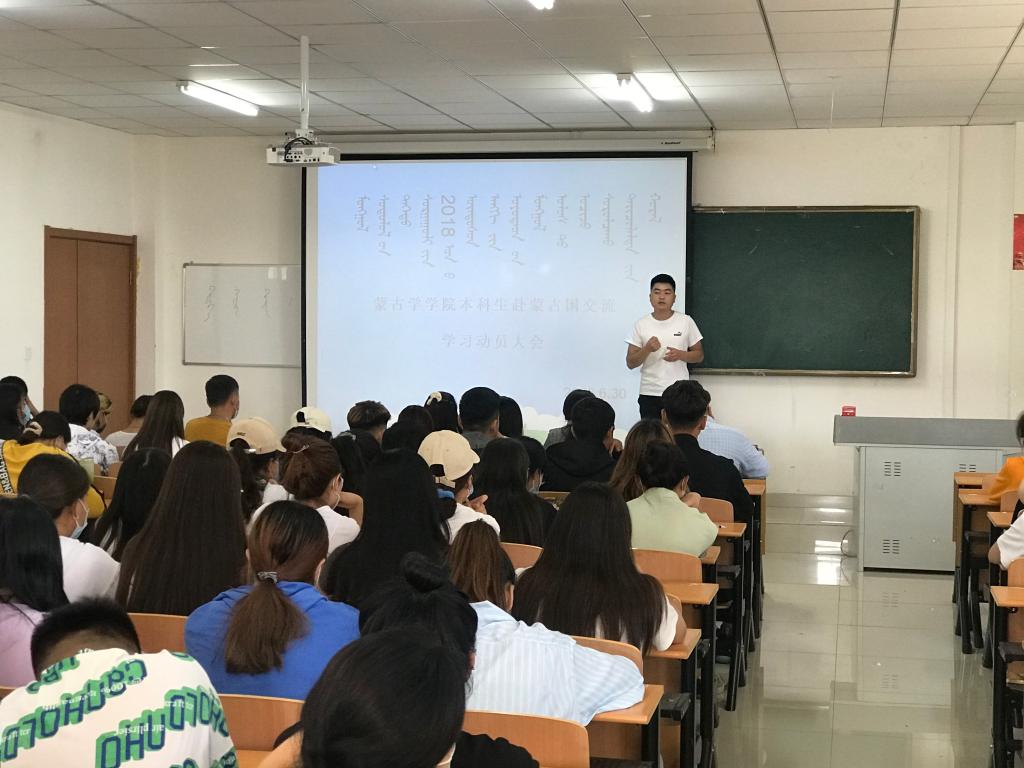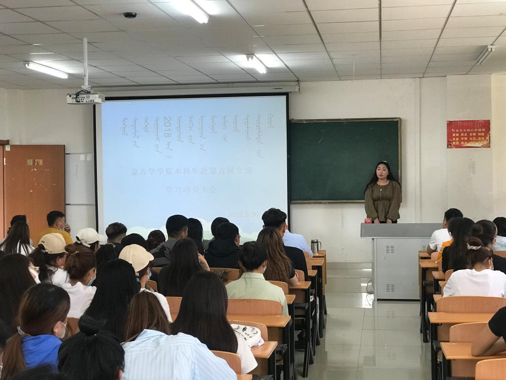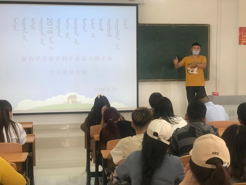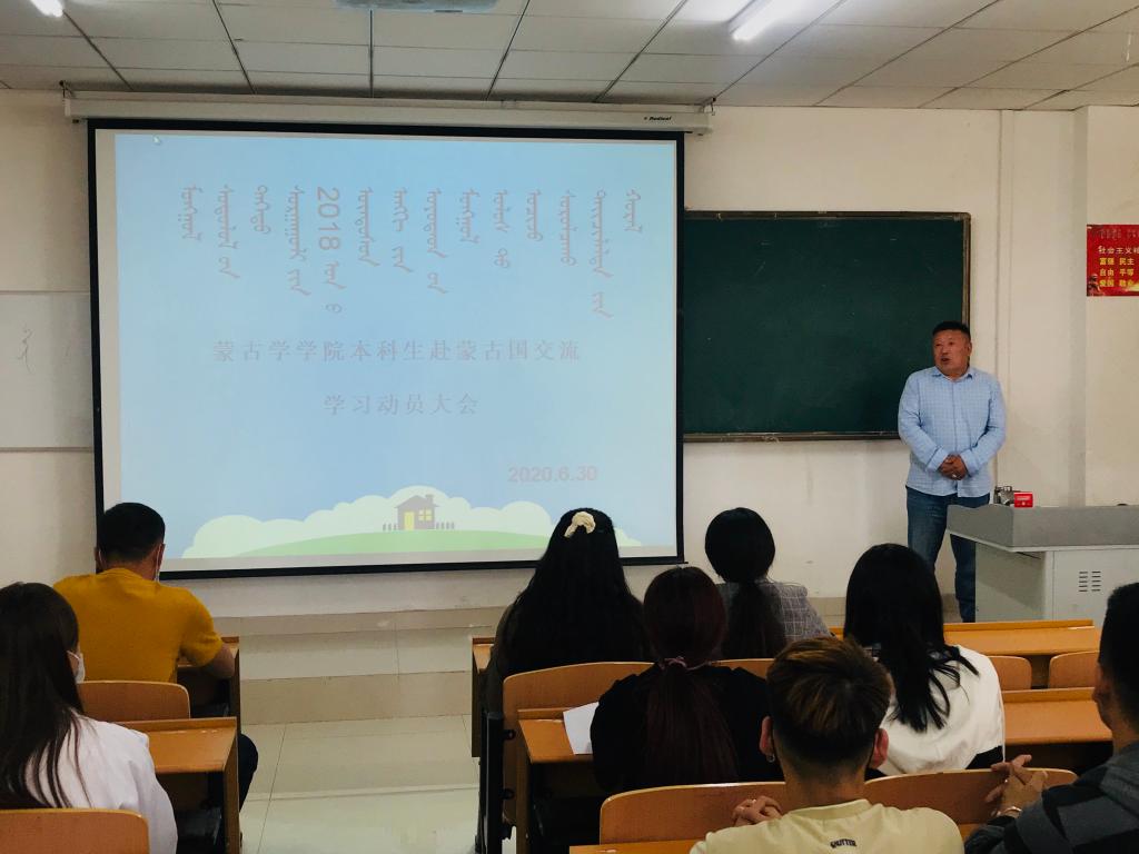 2020年6月30日,蒙古学学院中国少数民族语言文学、学前教育(蒙授)专业举办了2018级中蒙“2+1+1”合作计划动员大会。蒙古学学院副院长呼和满都拉,教师代表牡丹、朝鲁门、乌日罕,2019年度校际合作交换生出席了大会,蒙古语言文学教研室主任乌恩其教授主持了大会。