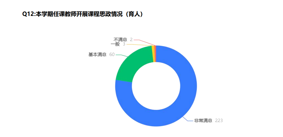 从此次学调查问卷的反馈情况来看,我院大多数教师十分敬业、责任心强;重视教学方法的灵活运用;能积极创设与本节课相关的教学氛围;激发学生的学习动机,调动学生参与课堂的学习积极性;注重师生之间的互动性。大多数学生认可任课教师的育人管理模式。本次调查总体上反应效果较好,学生对我院教师授课状况评价较高。但期间仍存在一些问题需要及时修改。