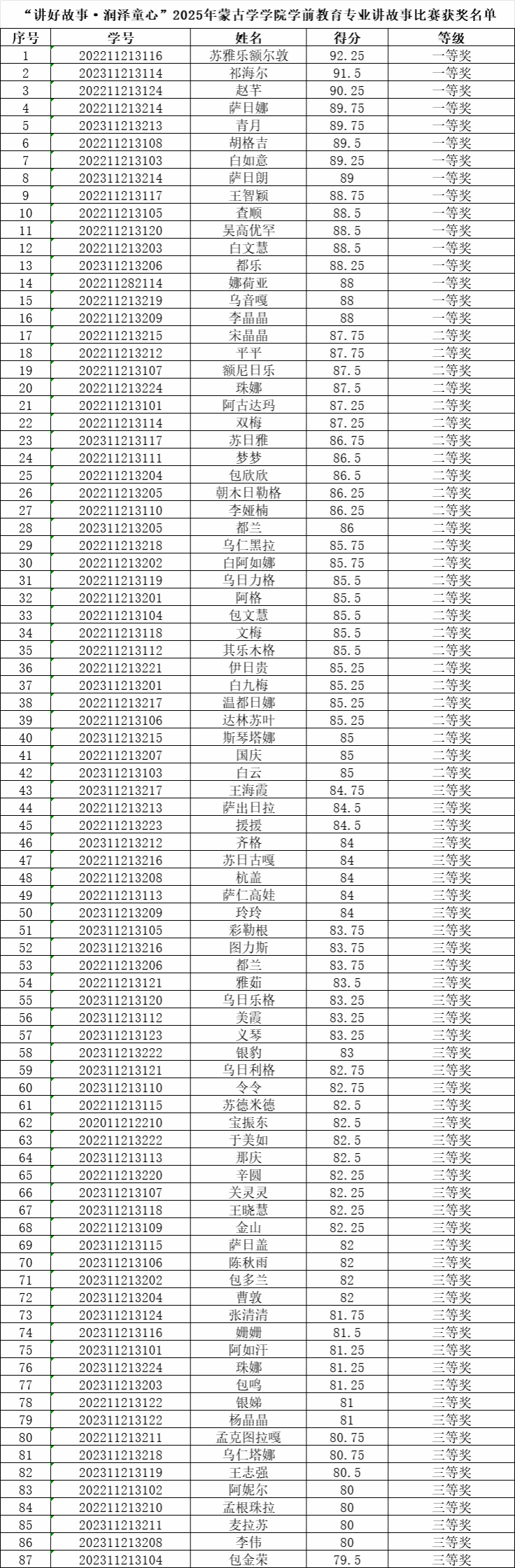 为提升学前教育专业学生的语言表达与教学实践能力,弘扬中华优秀传统文化,蒙古学学院于2025年4月17日在学院智慧教室举办“讲好故事·润泽童心”学前教育专业讲故事比赛,比赛由学前教育系系主任铁梅副教授、哈顺通拉嘎老师、英雄老师、白云鹏老师担任评委,2022级、2023级学前教育专业共87名学生参与。