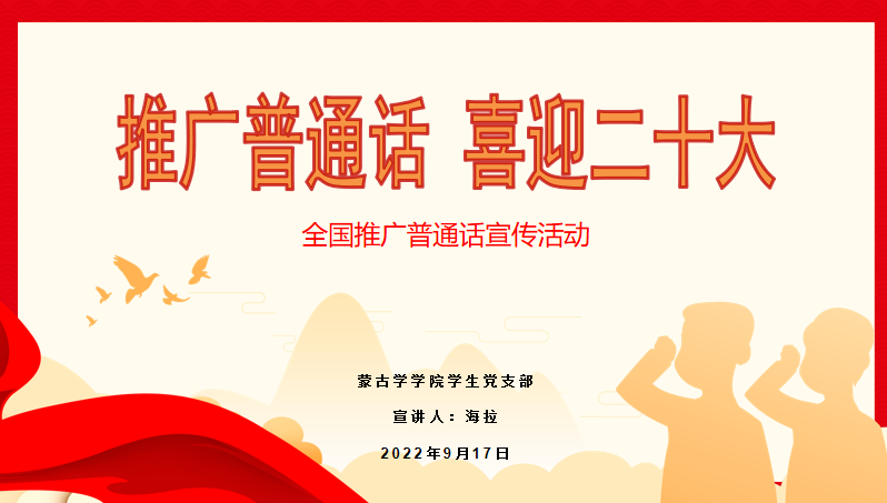 蒙古学学院学生党支部带领团总支2022917日在学院公共教室联合开展了推广普通话喜迎二十大宣讲活动。通过本次活动让同学们提高对普通话学习重要性的认识,积极练习普通话、提高普通话水平