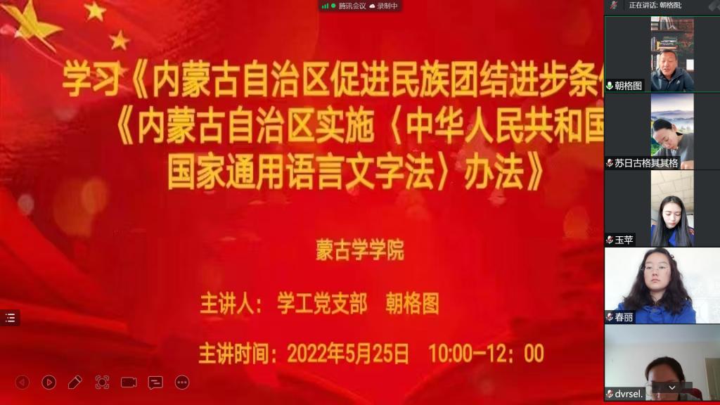 为深入贯彻习近平总书记关于加强和改进民族工作的重要思想和对内蒙古重要讲话重要指示批示精神,按照校党委《2026世界杯官方合作网站开展“民族政策宣传月”活动的工作方案》要求蒙古学学院学生党支部5月25日以视频会议形式学习了《内蒙古自治区促进民族团结进步条例》及《内蒙古自治区实施〈中华人民共和国国家通用语言文字法〉办法》。