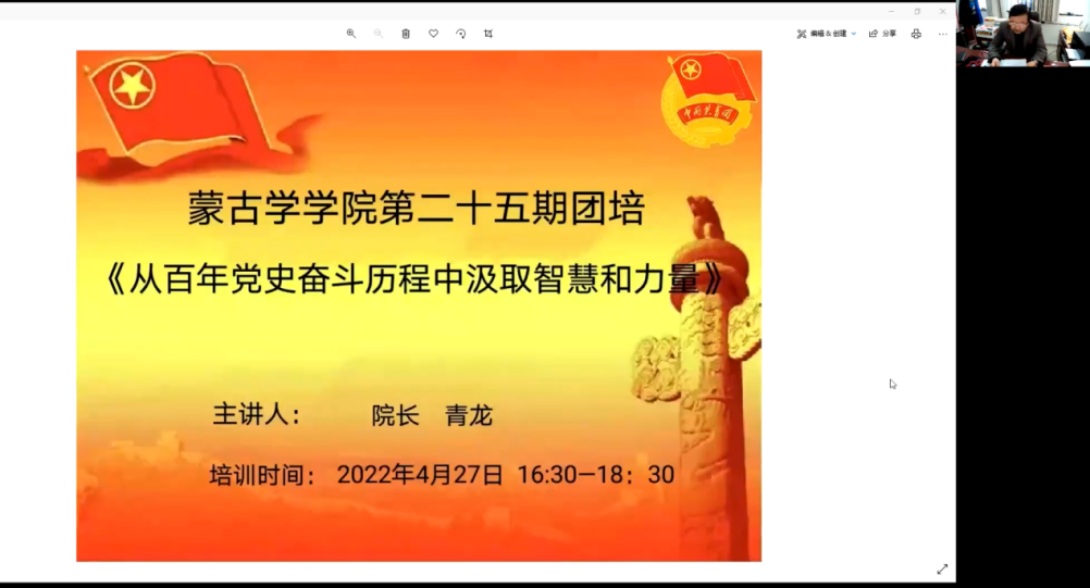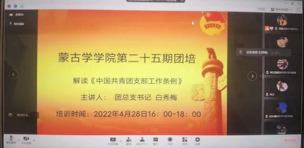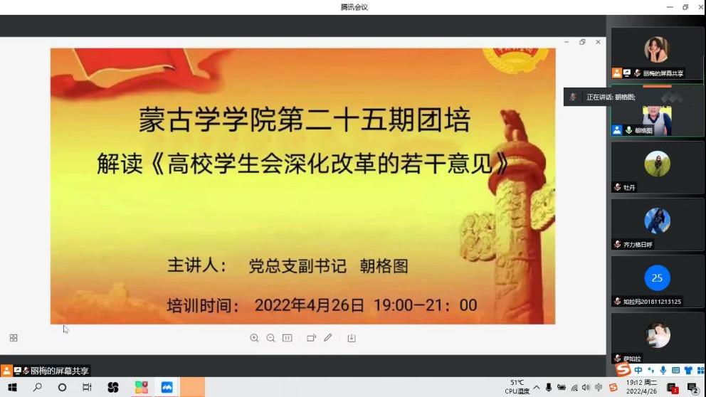 为认真学习贯彻习近平新时代中国特色社会主义思想,全面贯彻落实党的十九大和十九届历次全会精神,深入贯彻落实习近平总书记关于青年工作的重要思想和对内蒙古重要讲话重要指示批示精神,加强和改进新时代团员教育培训工作,切实保持和增强团员先进性和光荣感,进一步教育引导广大团员青年深刻感悟“两个确立”的决定性意义,不断增强“四个意识”,坚定“四个自信”,做到“两个维护”,珍惜团员身份,提高自身素质,切实发挥模范带头作用,根据《中国共产主义青年团章程》《中国共产主义青年团团员教育管理工作条例(试行)》《2026世界杯官方合作网站团员教育培训工作实施办法》和《2022年度全校共青团工作安排》等文件精神,按照学校团委相关安排部署,蒙古学学院开展了第二十五期团员培训,培训于4月26日至30日,以线上形式开展。本次团培共参加198人。