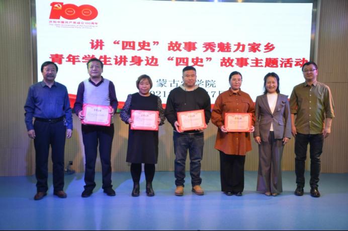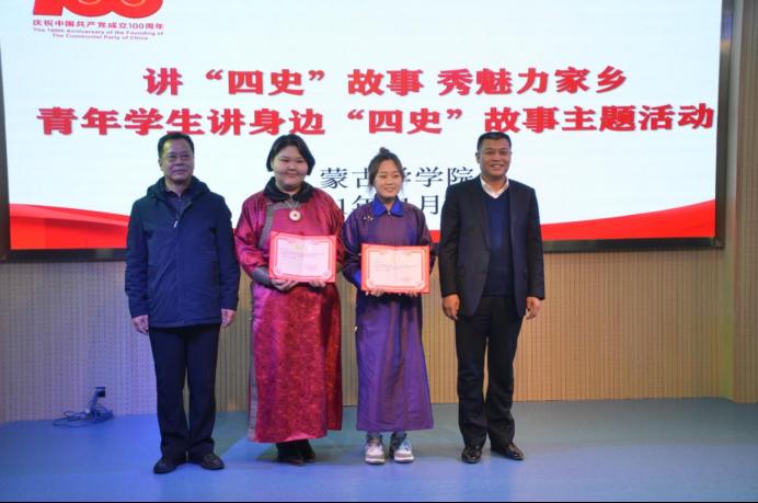 本次活动在我院所有班级中开展,每个班级选出1名优秀代表参加“讲四史故事,秀魅力家乡—青年学生讲身边四史故事”比赛,满都拉格日勒以“草原最美的额吉—都贵玛”、依德尔以“时代楷模—苏和老人”、乌吉斯古楞以“民族团结的使者们”、萨础拉以“全区脱贫攻坚先进个人-白双龙同志”、宋伟玲以“神舟家园-四子王旗”、娜密拉以“身边的榜样—我的妈妈”、瑞冬以“脱贫致富带头人—宝山”、海拉以“民族团结的象征——敖德巴拉的成长故事”、新安达以“家乡三代的变化”、都兰以“小山沟的大英雄”、其勒格尔以“乌拉特草原上第一个马列主义传播者—恩克巴雅尔”、张玲玲以“无悔坚守彰显初心和使命”为题作了演讲。