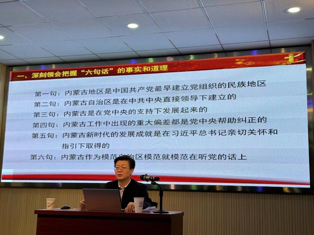 朱玉东紧扣“感党恩、听党话、跟党走”主题,以“铸牢中华民族共同体意识”为主线,围绕深刻领会把握“六句话的事实和道理”,深切领会体悟习近平总书记对内蒙古的关怀厚爱和期望重托,深入学习领会、全面准确把握《关于推动内蒙古高质量发展奋力书写中国式现代化新篇章的意见》精神,以奋斗姿态激扬青春,不负时代,不负年华等四部分内容,用丰富史实和客观事实,全面细致阐述了“六句话的事实和道理”,深刻阐释了党中央和习近平总书记对内蒙古的亲切关怀,诠释了内蒙古各族人民始终感党恩、听党话、跟党走,内蒙古才有了今天的大好发展局面,各族人民才有了今天的幸福生活。他希望广大师生要深刻认识、理解“六句话的事实和道理”,始终做到思想认同、行动拥护,发自内心地感恩党、感恩党中央,勉励蒙古学学院学子立志做有理想、敢担当、能吃苦、肯奋斗的新时代好青年,在书写中国式现代化内蒙古新篇章的事业中贡献自己的青春力量。