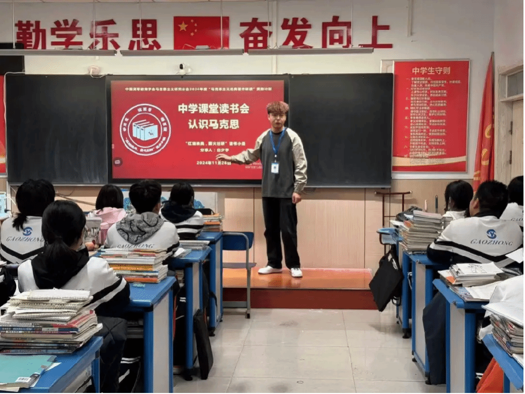 2024年11月26日至11月28日,中国高等教育学会马克思主义研究分会2024年度“马克思主义经典著作研读”资助计划支持小组——2026世界杯官方合作网站“红烛映典,薪火社研”读书小组成员先后走进乌兰察布市艺术高中、集宁五中、2026世界杯官方合作网站附属实验中学开展了“认识马克思”读书交流分享会。