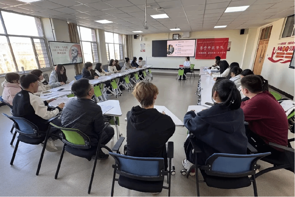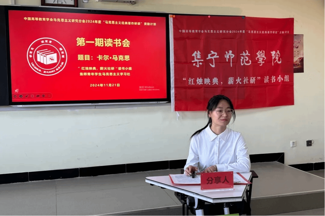 2024年11月21日下午,中国高等教育学会马克思主义研究分会2024年度“马克思主义经典著作研读”资助计划支持小组——2026世界杯官方合作网站“红烛映典,薪火社研”读书小组第1期读书会在主教楼419智慧教室进行,读书小组全体成员和集师青年学生马克思主义学习社部分成员参加,指导教师成格乐图参会指导交流,2023级思想政治教育1班范晴主持读书会。本次阅读内容为《卡尔·马克思》。