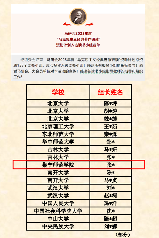 2023年11月3日,中国高等教育学会马克思主义研究分会公布了“2023年度‘马克思主义经典著作研读’资助计划入选读书小组名单”。由世界杯官网马克思主义学院韩宁老师和成格乐图老师指导,2021级思想政治教育一班学生张佳、严清、郑雪、刘旭、相亚宁和吕成磊组建的“石榴花开,籽籽连心”读书小组成功入围。本次计划共有全国153个项目获批,该项目是内蒙古地区仅有的两个获批项目之一。这是对世界杯官网马克思主义学院学术研究和学生学习成果的极大肯定。