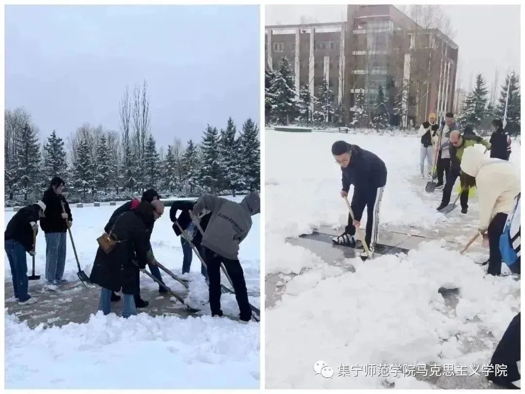 老师、同学们积极参与到除雪志愿服务活动当中。由于气温较低,部分雪被压得很瓷实,清扫工作十分困难,但是老师、同学们不顾严寒,积极行动,纷纷拿着扫雪工具,集中对路上的积雪进行清理,大家扫的扫、铲的铲,相互配合、齐心协力,干劲十足。经过一个多小时的辛勤劳动,清扫出了一条条干净、平坦的道路,为师生的出行提供了便利。