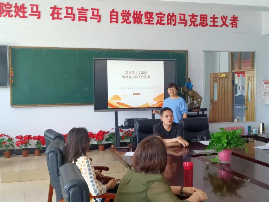 2022年7月6日,马克思主义学院教师党支部书记吴红杏讲党课,介绍了马克思主义学院教师党支部成立以来的工作成绩,党建的情况和工作的亮点、不足,以及以后工作的方向,对以往的工作做了一个梳理。