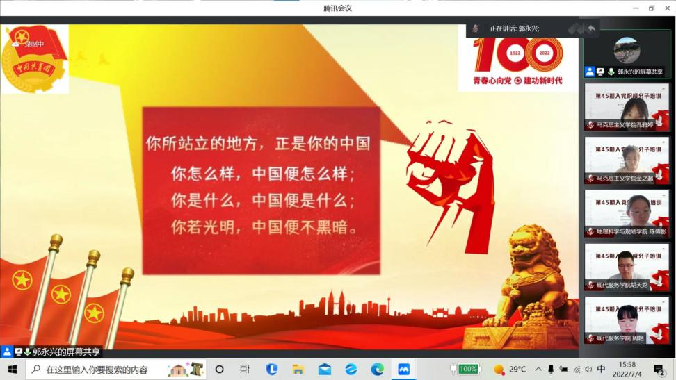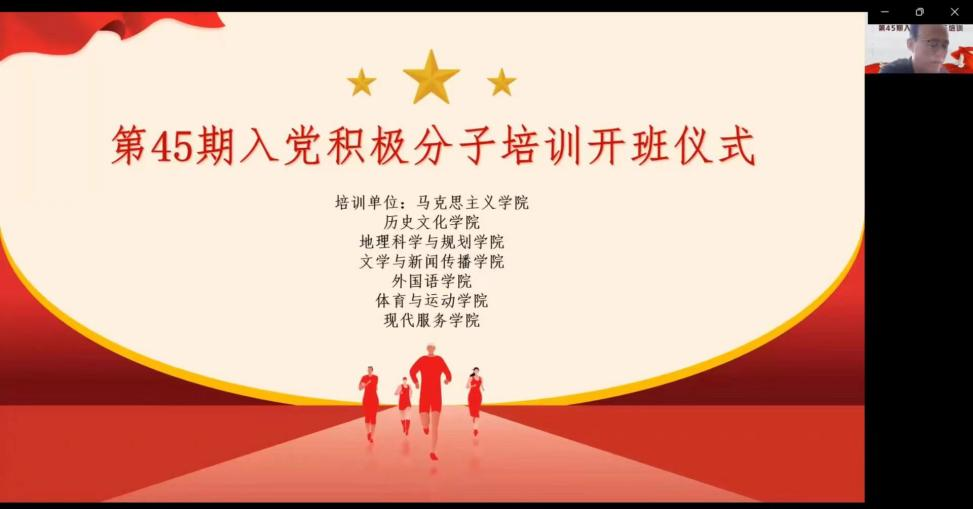 为加强入党积极分子对党的基本理论、基本路线、基本纲领、基本知识的全面理解,深入学习贯彻习近平新时代中国特色社会主义思想,保证发展党员质量,把好党员入口关,马克思主义学院、历史文化学院、地理科学与规划学院、文学与新闻传播学院、外国语学院、体育与运动学院、现代服务学院于2022年7月4日至7月6日联合举办了第45期入党积极分子培训,7个学院共210名入党积极分子参加培训。马克思主义学院党总支副书记胡志胜参加开训仪式并讲话,党委宣传部副部长田博、马克思主义学院教师郭永兴、成格乐图、韩宁及地理科学与规划学院教师李佳讲授专题党课。