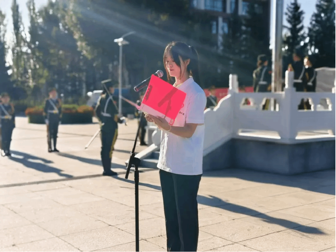 伴随着国旗护卫队铿锵有力的步伐,全校师生齐声高唱国歌,鲜艳的五星红旗在晨曦中缓缓升起,迎风飘扬。